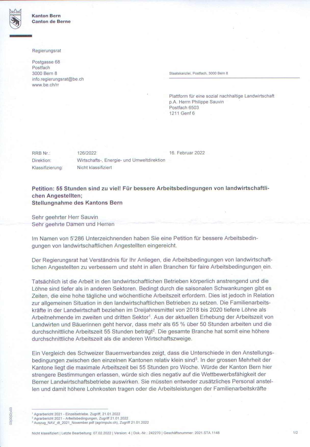 Le gouvernement du canton de Berne rejette la pétition "55 heures c'est trop, pour de meilleures conditions de travail pour les employé-e-s agricoles" par courrier du 16 février 2022 !